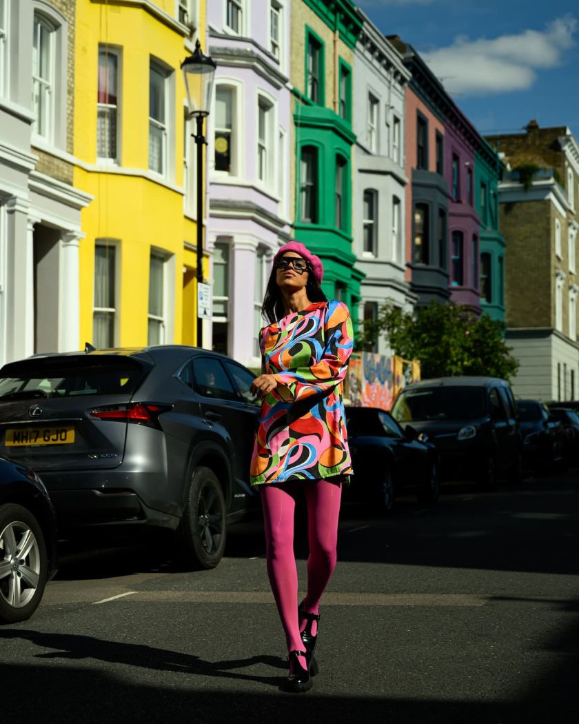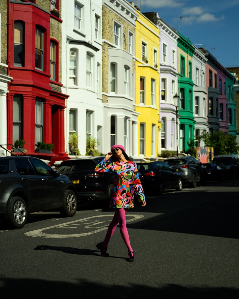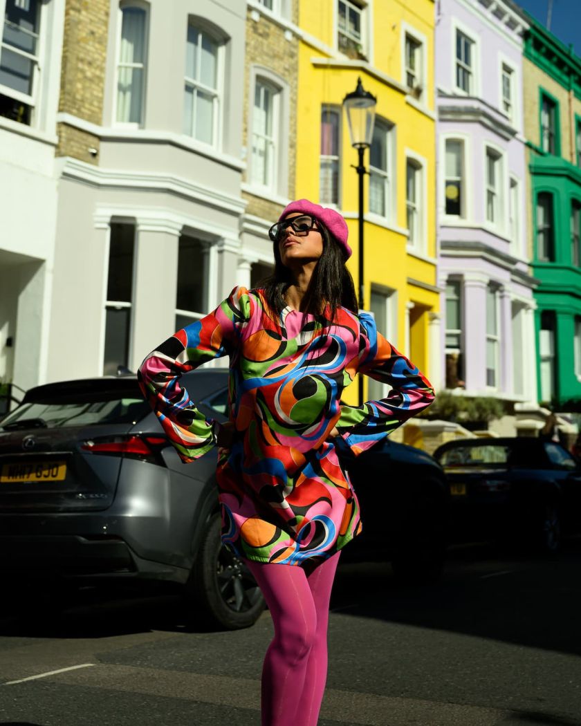 A chic A-line mini with bell sleeves, gathered shoulders, back zipper, full lining, and an exclusive Bossy Girl print.