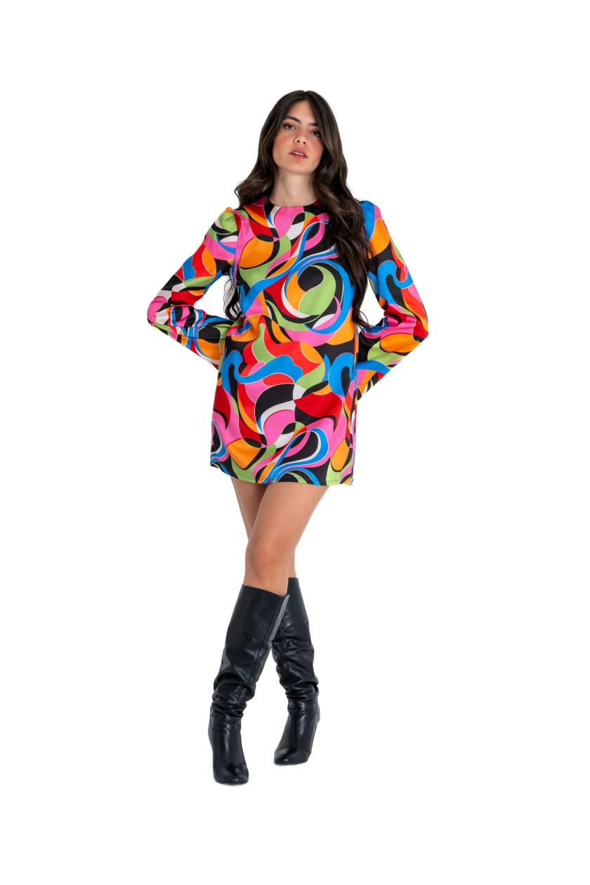 100% Polyester (PES)A chic A-line mini with bell sleeves, gathered shoulders, back zipper, full lining, and an exclusive Bossy Girl print.