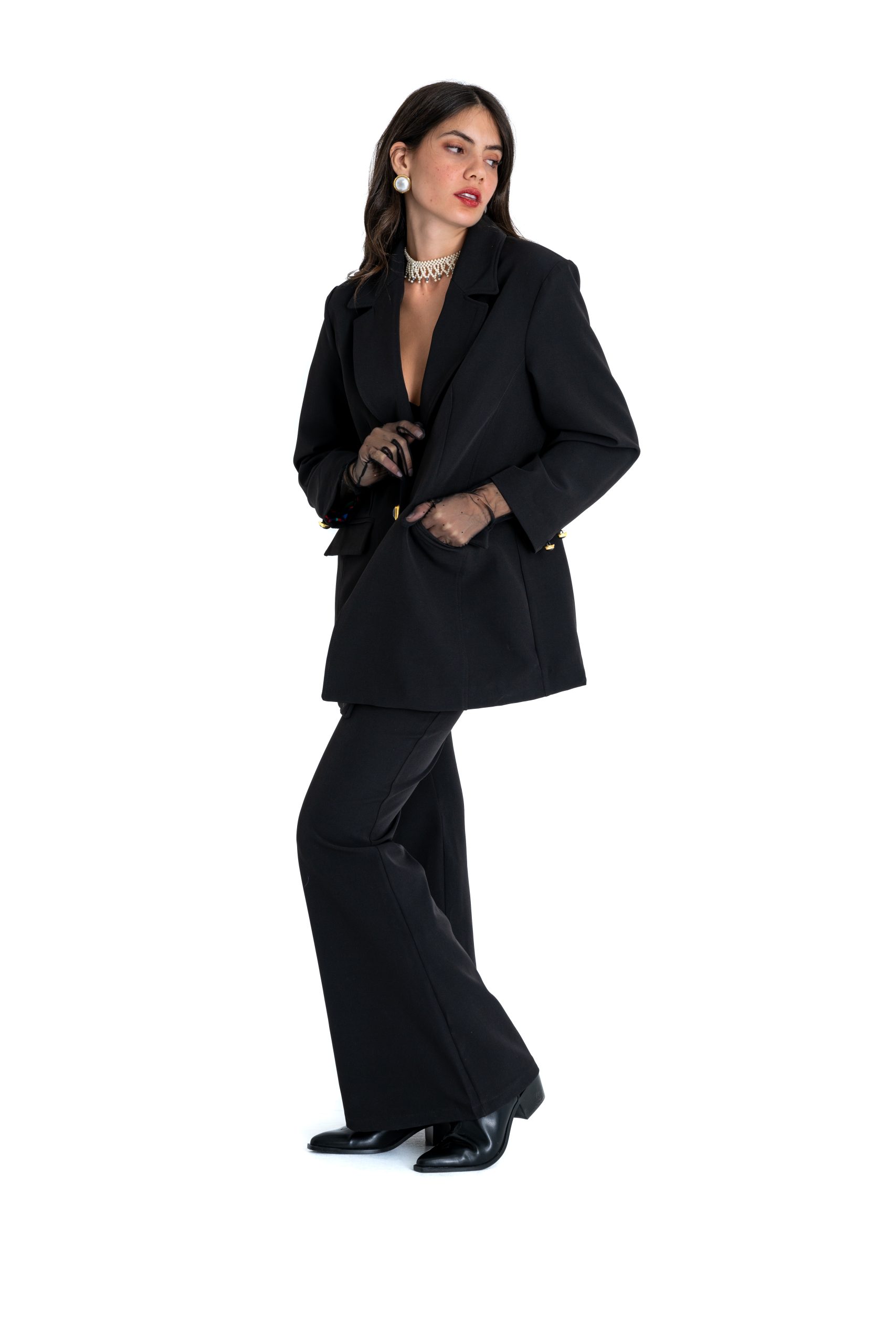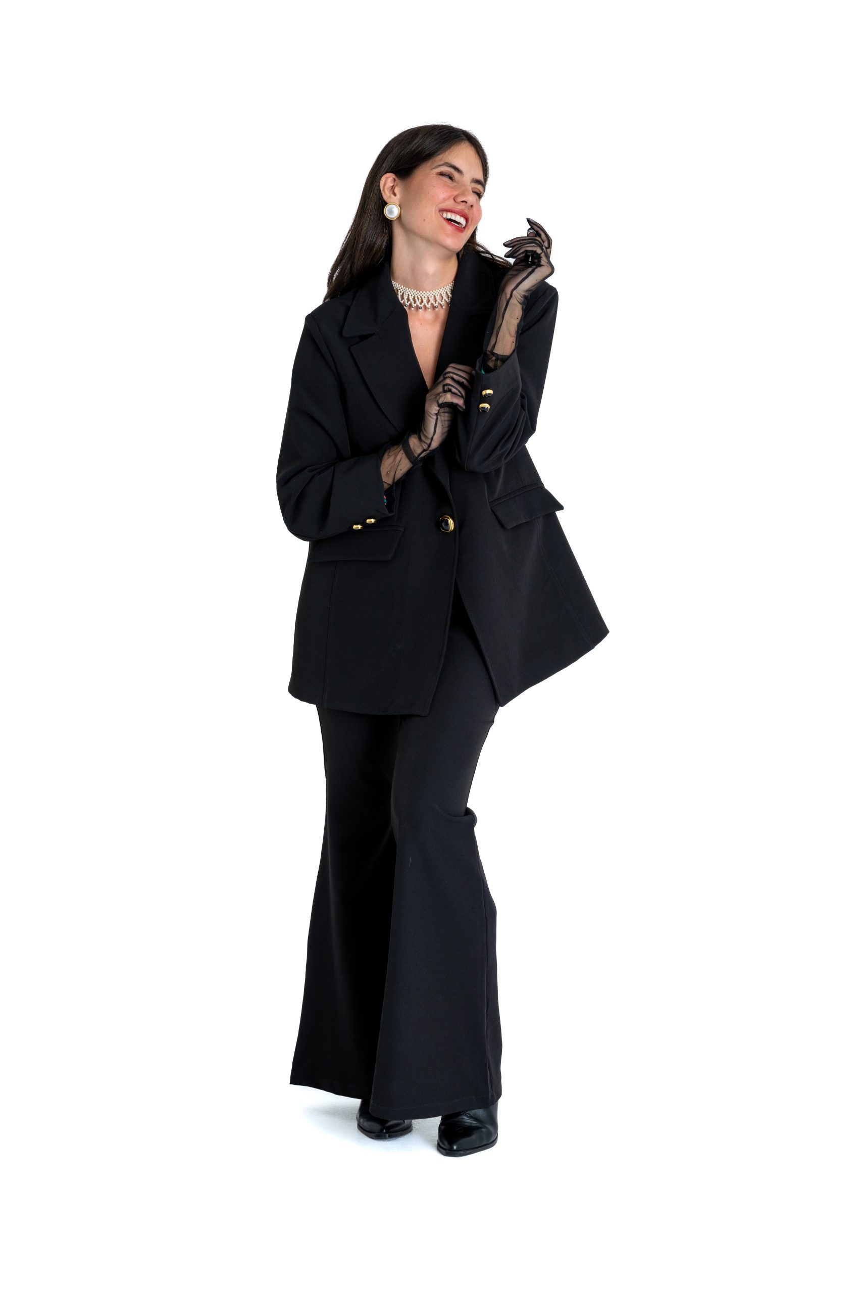The Black High-Waisted Flared Pants are a timeless wardrobe essential designed in structured fabric for a sleek and elegant fit. Featuring an internal elastic waistband, front zipper, and button closure, they offer both comfort and a flattering silhouette. Perfect for both everyday wear and more formal occasions.Design Features