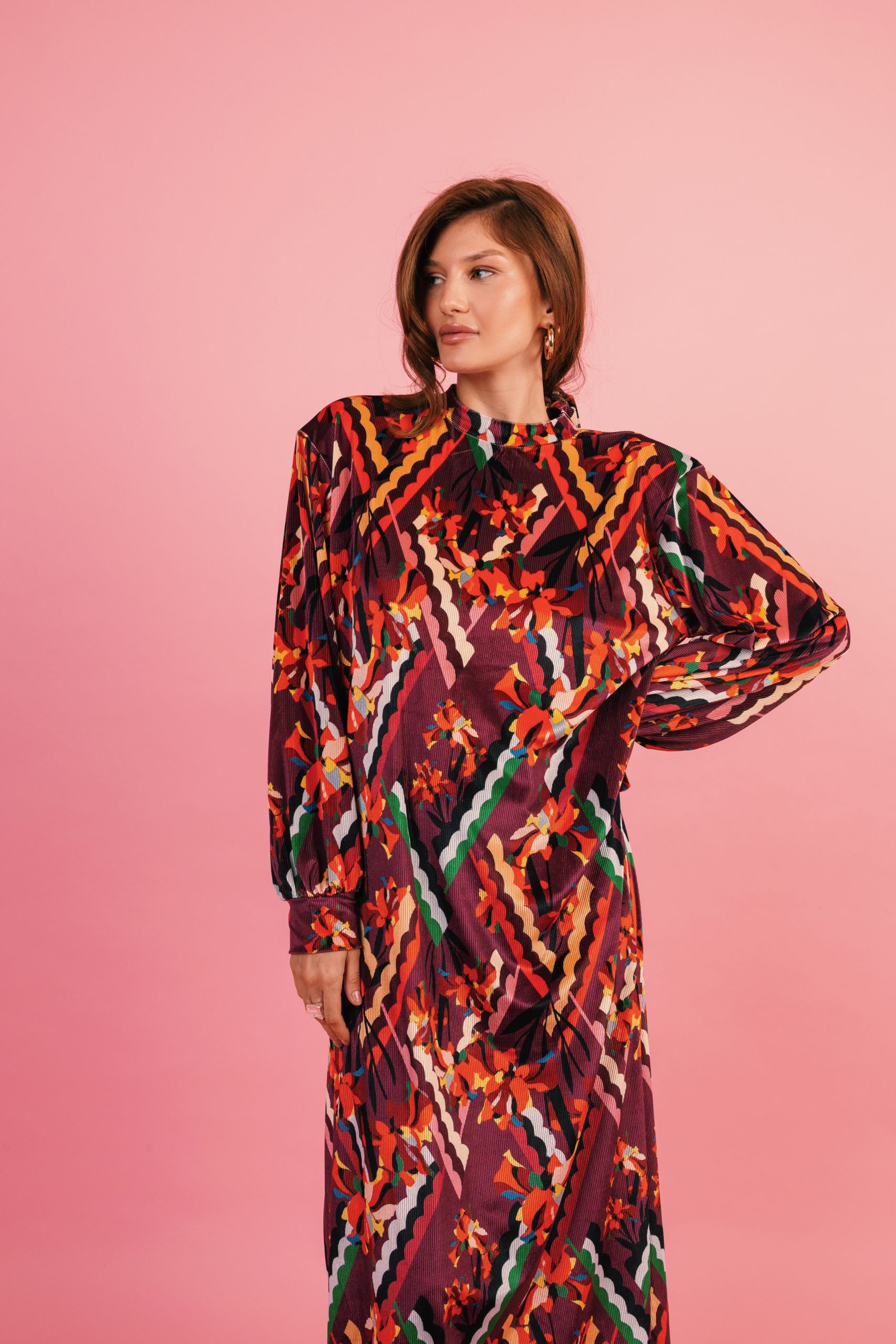 92% Polyester (PES), 8% Elastane (ELAST)The Vivienne Dress: an oversized velvet-rib maxi dress with side slits, shoulder pads, and a detachable belt for versatile winter styling.